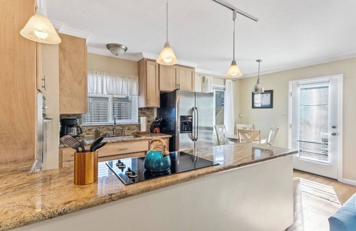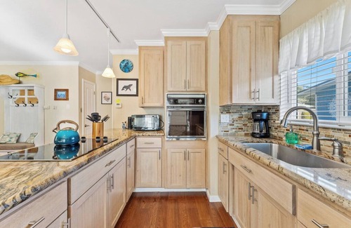 The open-concept living space seamlessly blends modern comfort with seaside charm, offering a crackling brick fireplace and French doors that lead to breezy outdoor areas. The stylish kitchen boasts granite countertops, high-end appliances, and everything you need to create the perfect home-cooked meal—your ideal home away from home!