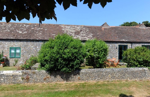 Settled into the picturesque countryside of Rousdon, Devon, this quaint barn conversion has been tastefully renovated into a holiday home. Perfect for families and their four-legged friend, 3 Home Farm South is within easy reach of local walks, historical sites and the popular town of Lyme Regis. Be welcomed into this historic property, marvelling at the beautiful stone exterior as you find your way into an open-plan living area with wooden flooring, high ceilings with traditional wooden roofbeams, making this space airy and full of light, as well as a delightful social area for all guests to enjoy. You will love relaxing in the sitting area, where two large blue sofas, a vintage rug and a coffee table present you with a wonderful space to enjoy a family games night, and when in need of a hot dinner, the nature of this open-plan space means that you will be able to cook as a family in the amply fitted kitchen, sporting contemporary cream furniture, before serving your masterpiece on the central dining table. If you fancy a quiet read, head up the charming wooden staircase to the snug, where the mezzanine level is completed by a skylight, sofa and TV. As the evening wears on, a beautiful double room with a wooden feature wall and storage offers you a homely place to cosy up for the night, and there is a smaller bunk room perfect for children. A shower-room offers a contemporary space where you can refresh after a long day spent at the beach. If a coffee in the sunshine sounds like a perfect morning to you, head out of the French windows in the living area to find a wonderful siting area with a patio, lawn and shrubs, full of the cottage feel of the rest of the property.