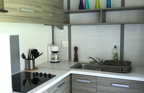 The kitchen is equipped with a stovetop and a refrigerator, as well as a coffee maker, an electric kettle, and a microwave. Other amenities include a BBQ grill, housekeeping, and heating.