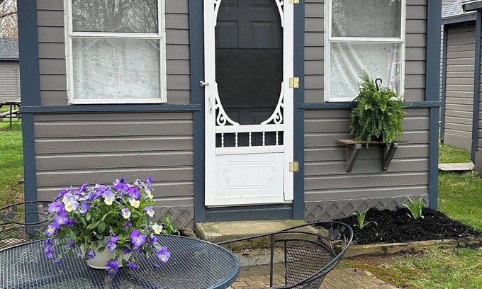Definitely a charmer with seating outside and a path to the door. We have a newly re-done pool available for our guests, a fire pit, and green space (all shared with the other cottages at Tiffany's Cottages).