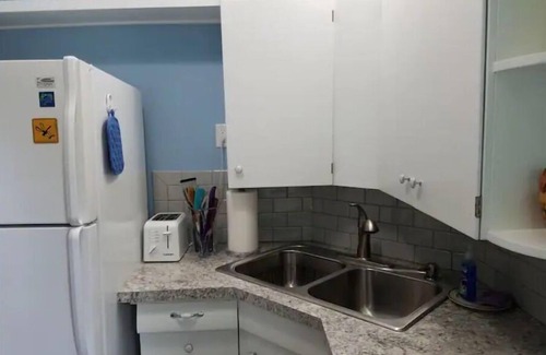 The apartment has been redecorated and there are lots of windows, so lots of light. The kitchen sink and counter have been upgraded to make cleaning up much easier. The bedroom has a queen size bed and there is a twin size air-bed, the height of a regular bed, which can fit in the living room. The entire space is for for my guests and the separate entrance makes it private.