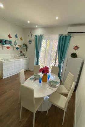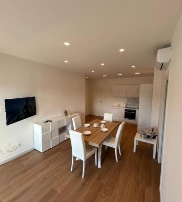 The entrance opens onto the corridor leading to the living area, furnished with a dining table, a sofa and a TV; next to the entrance is a spacious kitchen fully equipped with an oven, a dishwasher and a microwave.