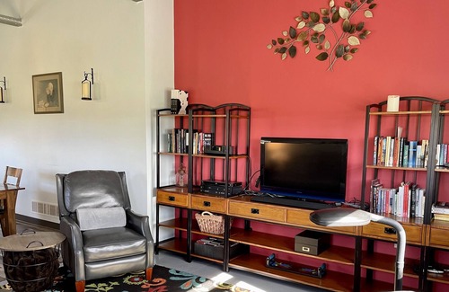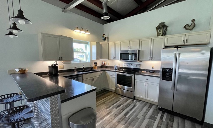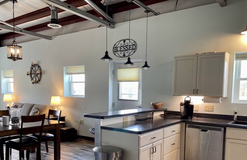The gravel driveway leads you off a country road and onto fifteen acres of woodland and meadow property where the farmhouse is situated. Pass by our main home and see our friendly hens while driving to your private entrance to the farmhouse. Inside, you'll find a spacious home with industrial yet cozy decor.
