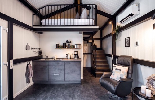 You will be staying in a 1-room house that spans across 28 square meters and is designed with modern and cozy furnishings. The living/dining area is situated on two levels, providing an open and spacious feel. You can access the balcony directly from this living space. The open gallery area features sloping ceilings with a ceiling height ranging from 1 to 120 cm and includes a double bed (160 cm wide, 200 cm long) without a separate enclosed wardrobe.