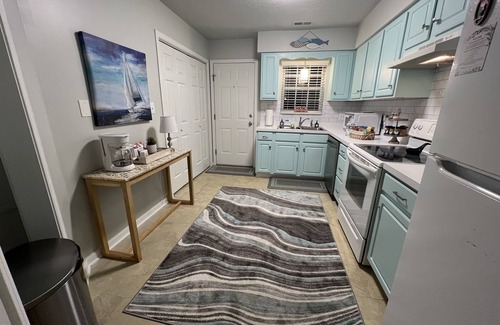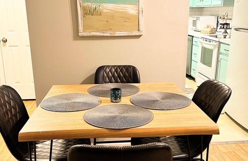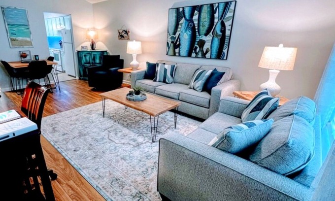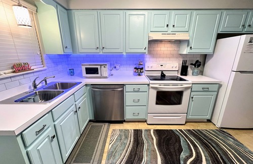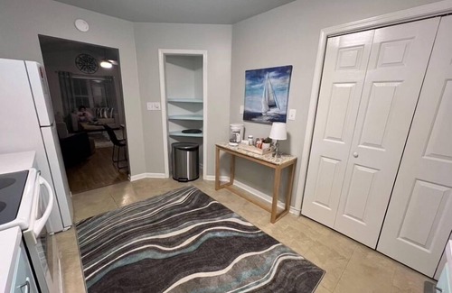Sunnyside Villa is Unit B in this charming duplex. In the spacious family room, guests will enjoy a 65" Smart TV (Netflix and Prime included), queen sleeper sofa, welcoming dining area, and desk for remote working. For an evening of family fun, there is an entertainment cabinet stocked with games, puzzles, books, and playing cards. The fully-equipped kitchen and convenient coffee bar have everything you need to create delicious meals. The front bedroom features a king bed with luxury linens, a Smart TV and an ensuite bathroom. The second bedroom includes a king bed with luxury linens and another full bathroom adjacent to the room. A convenient utility area with a washer/dryer, iron & ironing board is ready for use. Multiple sources of mood lighting will help to create the most desirable atmosphere: lighted mirrors and nightstands, colorful lights under the kitchen cabinets, dimmable track lights, 3-way bulbs in table lamps and night lights in all rooms. Additional features include multi-plug/USB charging ports in every room for rapid and simultaneous charging, modern ceiling fans, & plenty of storage space for clothing & luggage. Step outside to the patio area where a gas Weber grill and outdoor dining for four awaits. Park your boat (up to 21 ft) in the fenced-in back yard. This property is the ideal place to call home while away with loved ones!