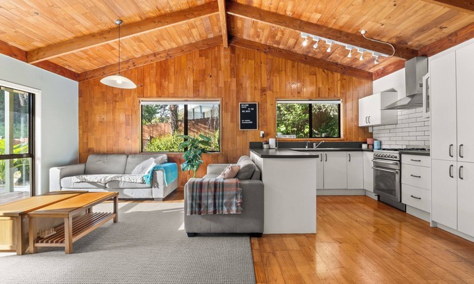 Drop your bags and transition seamlessly into vacation mode. The private deck provides an ideal spot to savor the serene sounds of Tuis singing and occasional visits from cows in the backyard.