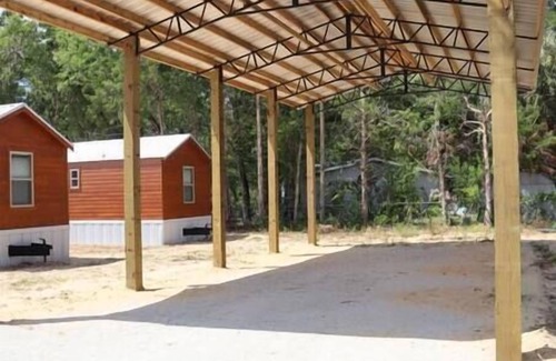 Truth Harbor Downtown Steinhatchee RV Spot with a 30 amp and 50 amp hook up, water and sewer. 14FT tall pole barn with rocked base and drive-way covers the entire area for shade and perfect area for entertaining.