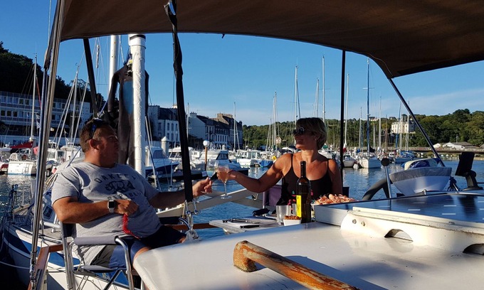 Based in the far west of Europe, in Brittany, you live to the rhythm of the marina, enjoy the terrace on the rear deck, the sun roof and sunbathing on a magnificent white sand beach! Air, space, a total change of scenery, nautical or pedestrian activities, lazing around on board or on the beach, vacations to allow you to recharge your energy for the start of the school year.