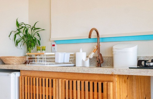 The kitchen is fully equipped with everything you need to cook: a minibar fridge, electric oven, 4-burner gas cooktop, blender, coffee maker, sandwich press, and a table for two. We've also included a dual-compartment recycling bin (for organic and recyclable waste) and a water purifier for added sustainability and convenience.