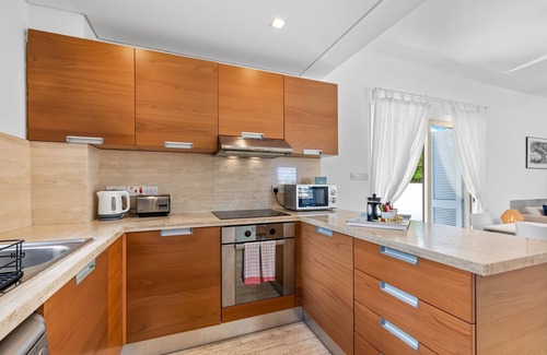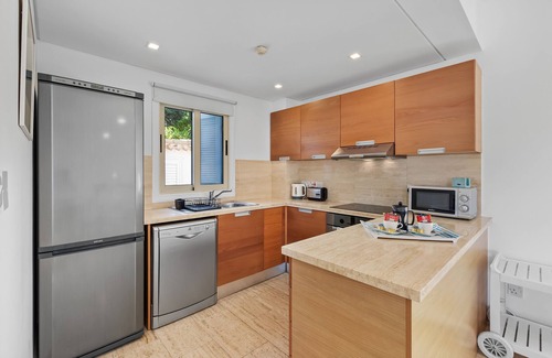 KitchenThe sleek, fully-equipped kitchen includes everything you'll need: hob/oven, fridge/freezer, microwave, and dishwasher. A convenient utility area with a washing machine and dryer is located in the downstairs bathroom.
