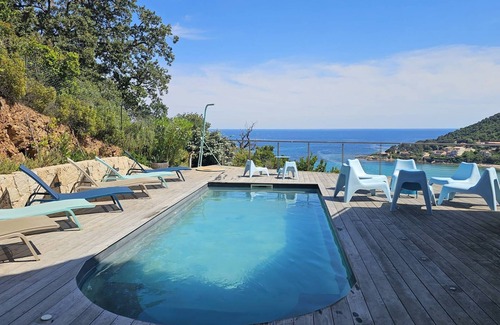 semi-covered terrace (35 m2) - panoramic sea view: teak garden furniture, deck chairs, garden with outdoor shower, summer kitchen with gas plancha.